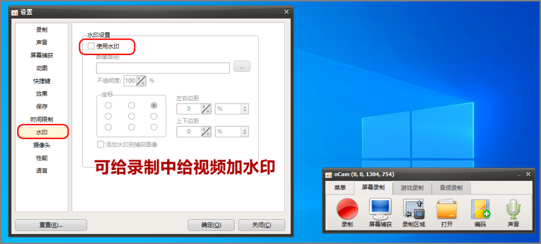 Watermark:有时你捕捉到一个视频并发布它, 你不想它被偷, 所以您可以设置程序, 并在右下角添加水。 例如。 您必须使用其他软件来创建水印图片。 当然, 您不能添加水印 。