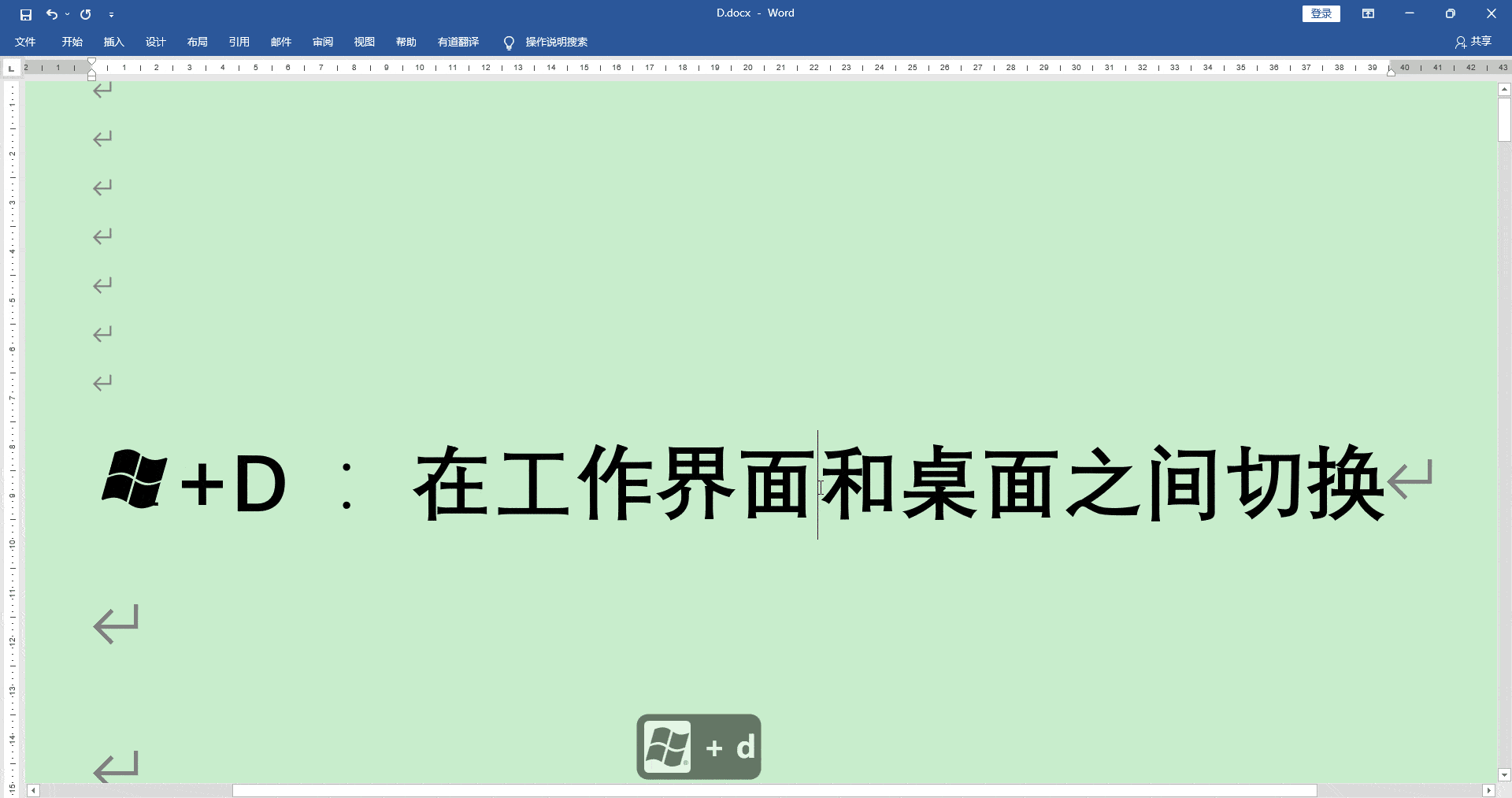 1, W+D: 返回到桌面, 然后按 W+D 键返回工作界面, 在工作界面和桌面之间切换 。