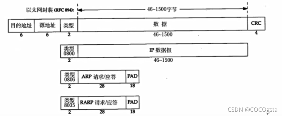 源MAC地址和目的地MAC地址每次都发生在Tainet前端和ARP请求中,该请求在链接层方面是多余的,但如果链接层是另一种网络,则可能有用。 硬件类型是指链层的网络类型,以太网络1,协议类型是指要转换的地址类型,0x0800是IP地址,最后两个地址长度分别为6和4字节。