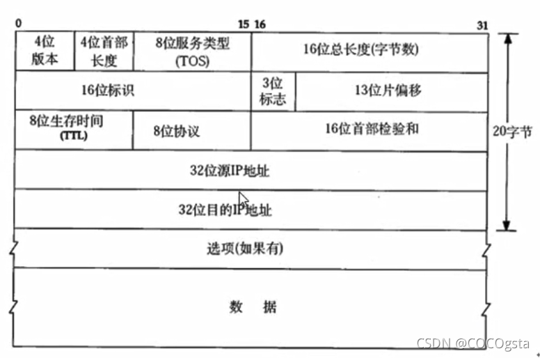 IP数据的长度和第一个部长级级别各不相同,但总是4乘以4整数。对于 IPv4, 4位数版本字段为4。 4位前部长的值为4个字节,最低值为5个字节,即至少4x5=20字节,即IP头没有选项,最高值为15个字节,最高值为60字节。8个TOS 字段中有3个用于确定IP数据报告的优先次序(目前已过时),4个用于可选服务类型(最小延迟、最高吞吐量、最高可靠性、最低成本),1个总是零。总长度是整个数据报告的字节(包括IP头和IP层有效载荷),每个路由器的数值降低1个,如果路线减少到零,则主机网络被拒绝,因此生存时间的单位是跳(hops)。协议字段显示顶级协议是TP、UDP、ICMP或IGMP。