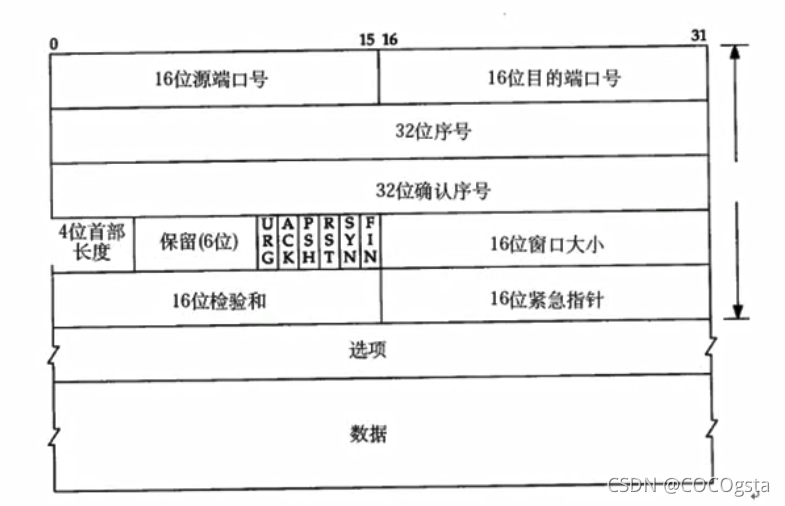与UDP协议一样,还有源码和目的地端口号,在通信两侧都有IP地址和端口号。 32位序列号、32位确认的序列号和窗口大小将在以后详细解释。 顶层四位部长和IP协议负责人相似,以四字节表示TCP头条长度,这样TCP的顶部可以高达4x15=60字节,如果没有选项字段,TCP的底部将是20字节。URG、ACK、PSH、RST、SYN、FIN是六个控制位置,本节将解释SYN、ACK、FIN、RST 4和其他位置,稍后将省略。