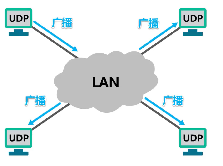 下图显示四个主机使用UDP协议在局域网上进行通信,其中之一可以向其他三个主机、多广播组或单一主机广播。 换句话说,UDP可以一对一、一对一、一对一、一对一和一对一通信。