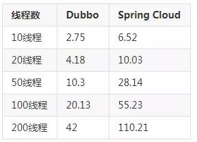 利用具有10个特点的波霍物体,请求10万次请求,Dubbo和Spring Cloud,每次使用不同数目的线条,均获得以下结果: