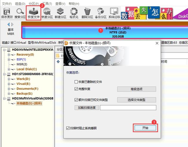 步骤2:选择无法读取的移动硬盘驱动器分区,然后单击“回收文件”按钮。一旦应用程序显示回收文件对话框,请按“启动”按钮。