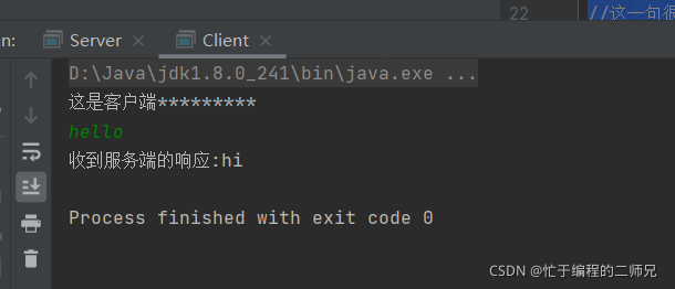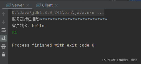 启动服务器和阴蒂后, 输入客户端的问候, 服务器会以 hi 回答 。