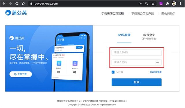 使用浏览器访问设备云管理平台: https://pgybox. org. I'm sorry, oray. com, 在 X1 和 管理密码( 默认管理员) 后面输入 SN 代码 。