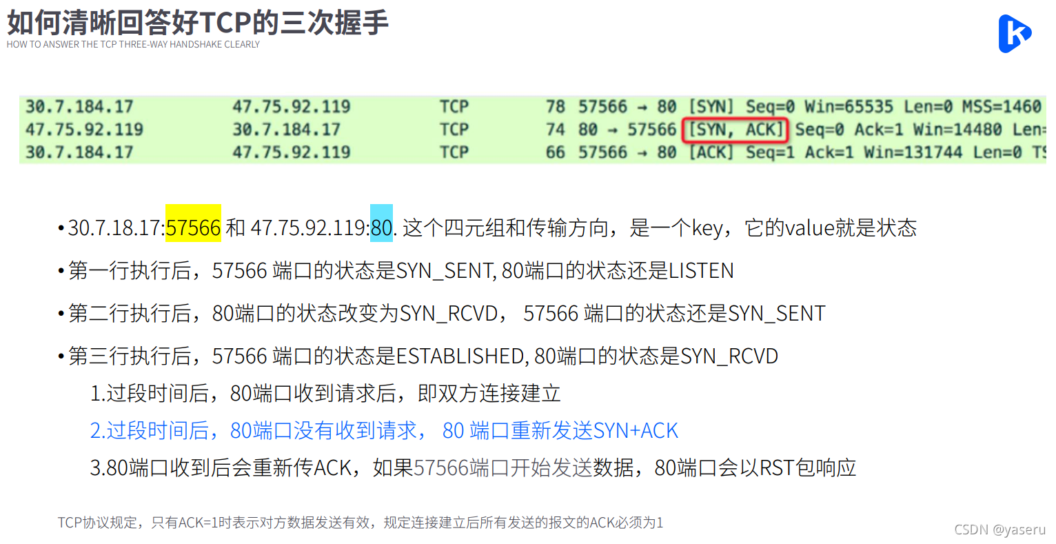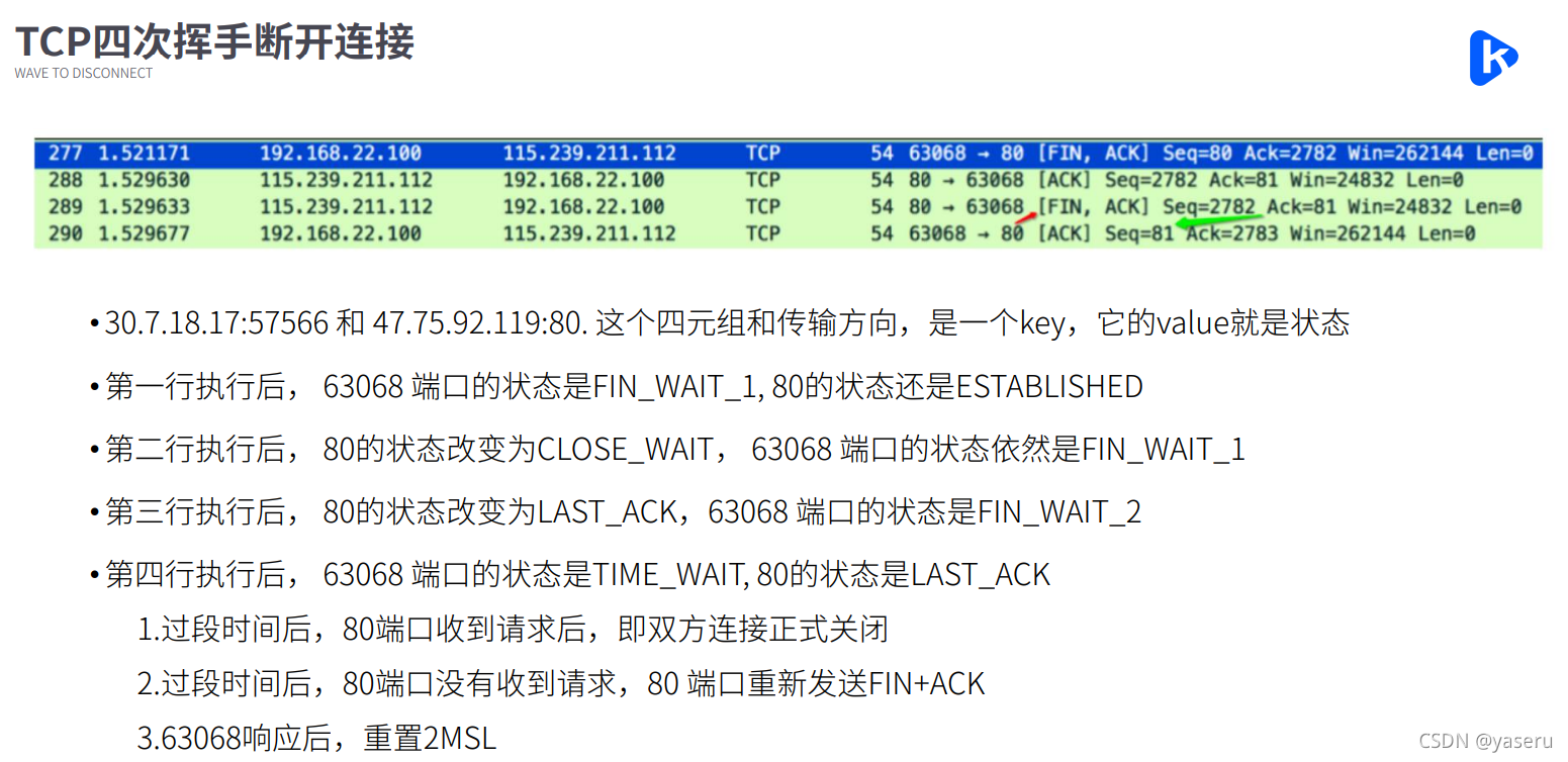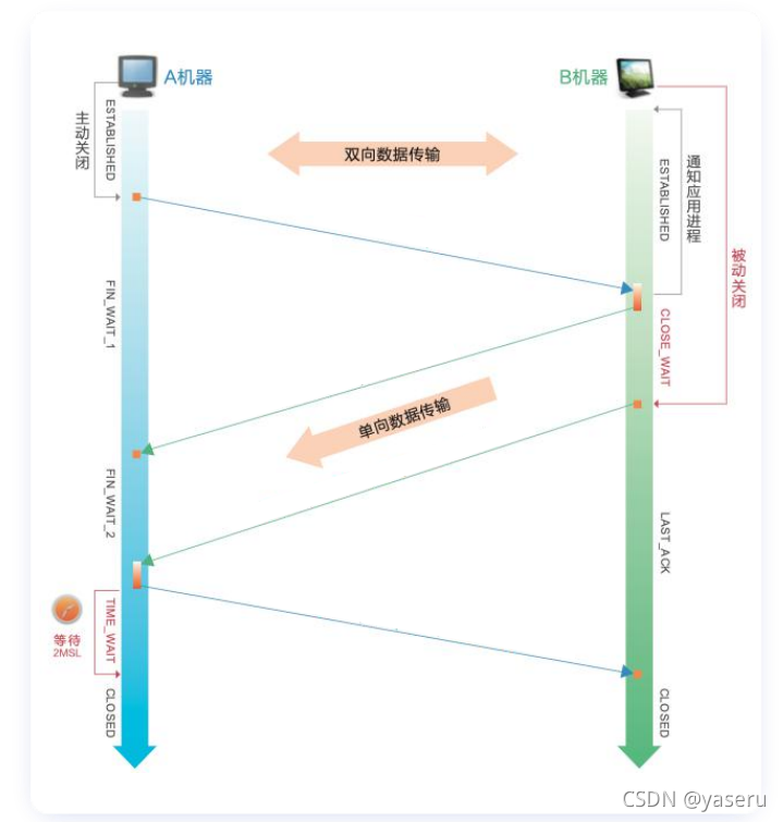 注意: 在发送 ACK 后, A 无法检查 B 是否收到它, 但是它重新确认 B 是否没收了它, 它会在此给 FIN+ACK 。 因此, A 等待时间稍长, 2MSL, 看看 B 是否将发送一个新的 FIN+ACK 。 如果没有, 可以确定 B 收到 ACK 后, TCP 这次将被释放 。