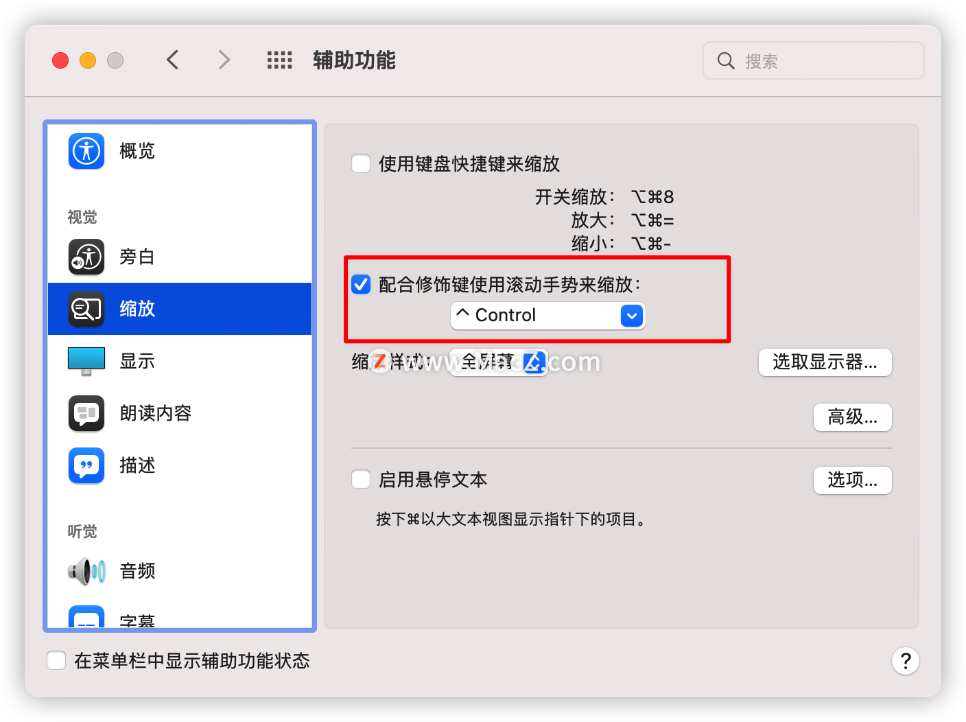 缩放功能与右手设置界面有关,如鼠标轮缩放 Mac 界面所示。