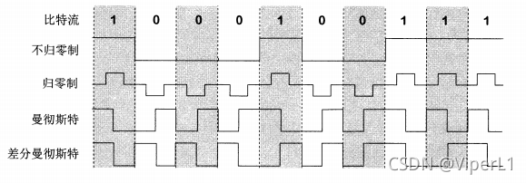 区别在曼彻斯特代码中:每个中心总是跳跃, 位元开始跳到1而不是0。