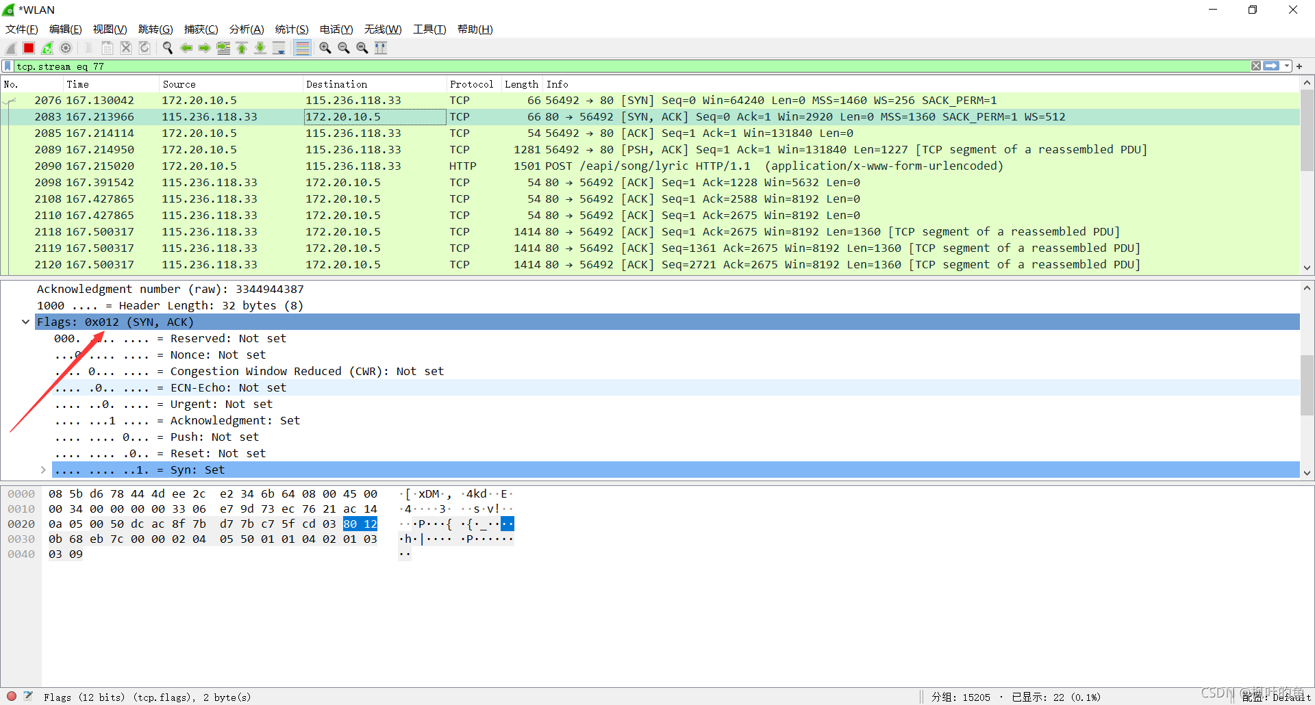2)第二条指令详细信息:第二次握手,同时提出确认请求