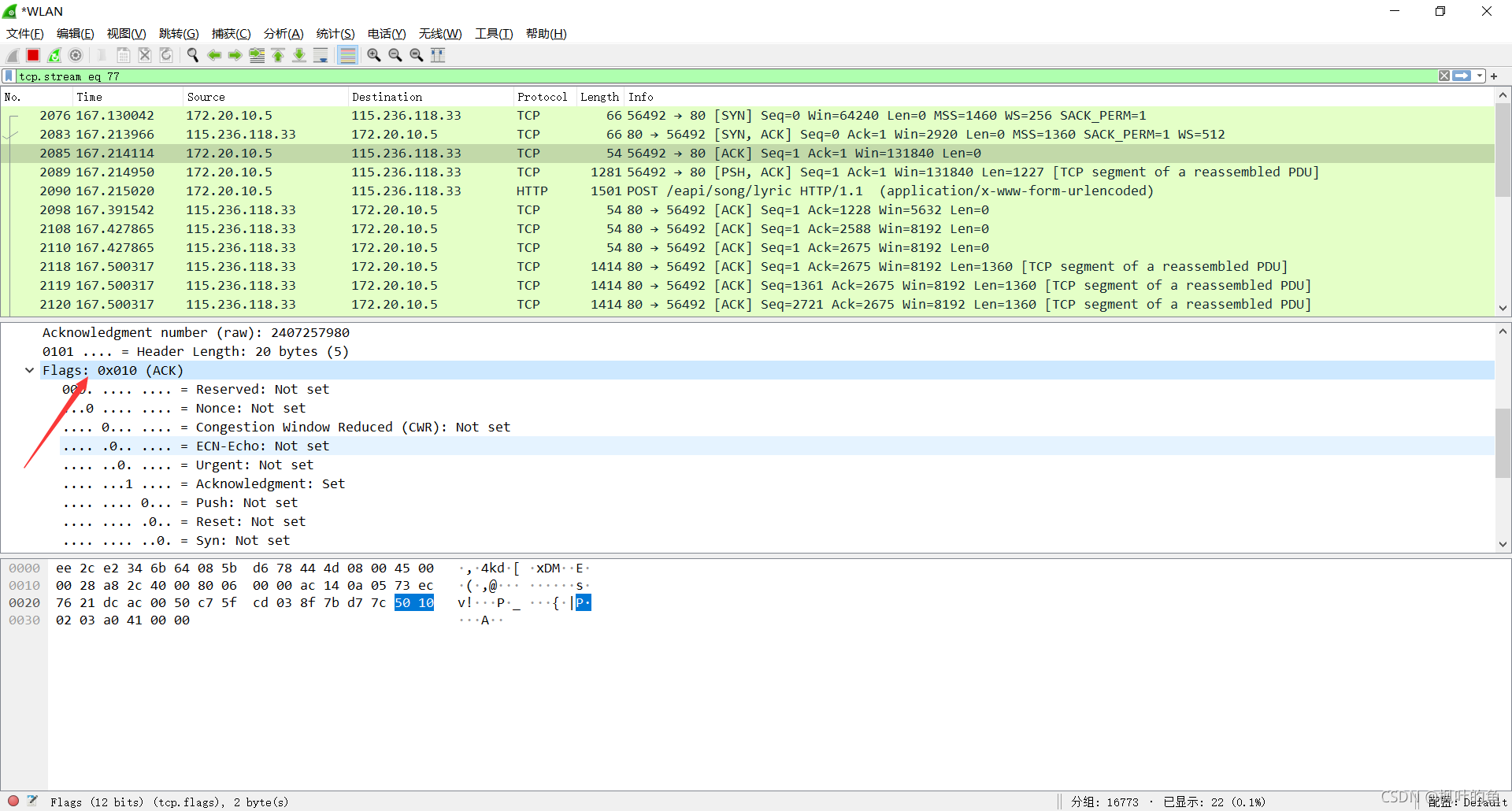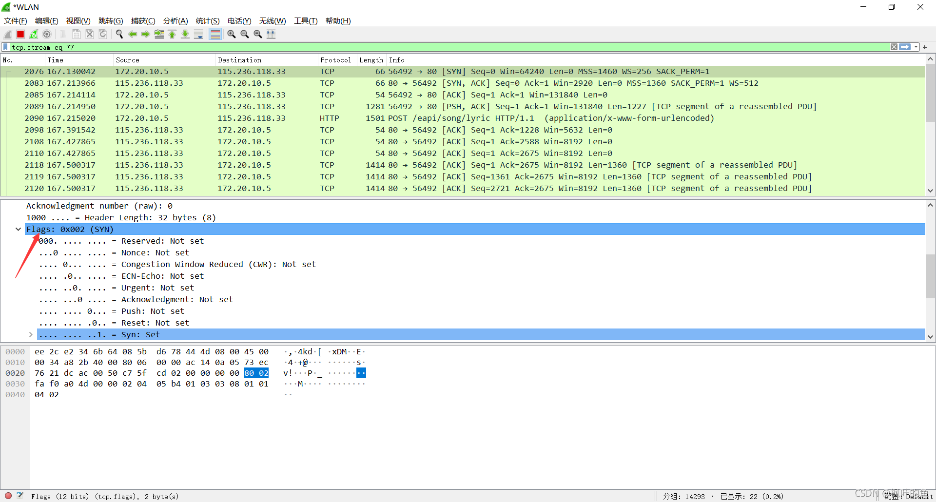 选择一个记录来观看三次握手, 然后右键单击跟踪流中的 tcp 流 。
