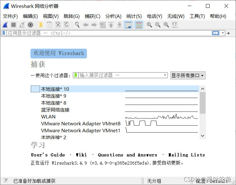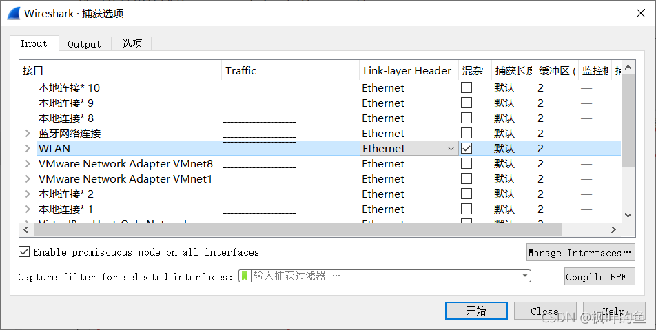 (2) 选择抓捕接口:通常选择互联网网络接口,以便捕获与网络相关的数据;否则,所捕捉的任何进一步数据都将对抓捕接口进行无用的记录;通常选择互联网网络接口,以便捕获与网络相关的数据;否则,所捕捉的任何进一步数据都将毫无用处。