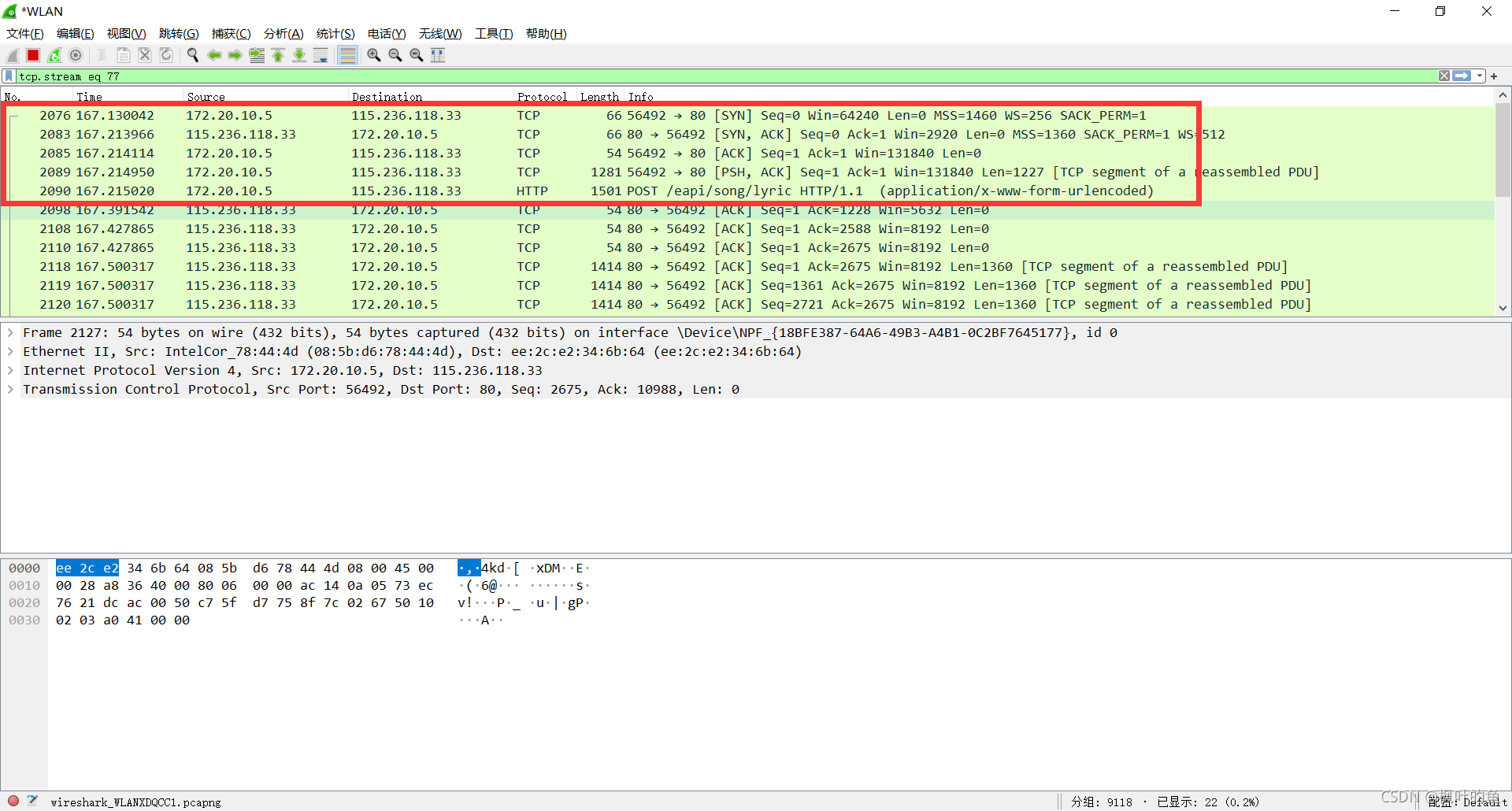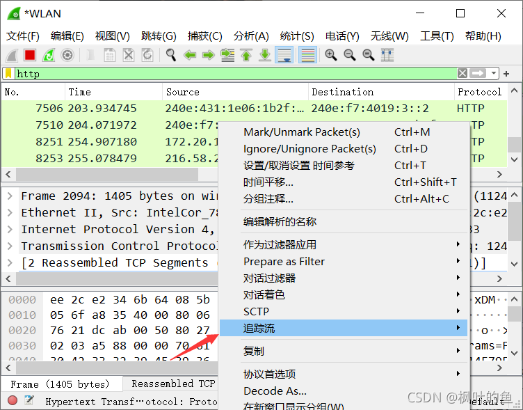 (7) 数据重新排列。Wiresark的重组功能允许在会话中从单独的数据集中重组信息,或者重组整个图像或文件。 由于转移的文档往往更大,信息分散在几个数据包中。 为了查看整个图片或文件,此时需要重建数据的技术。