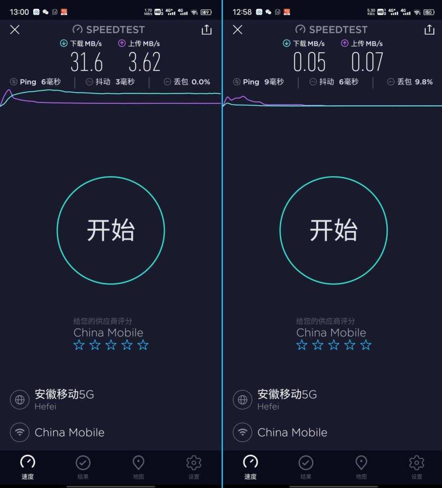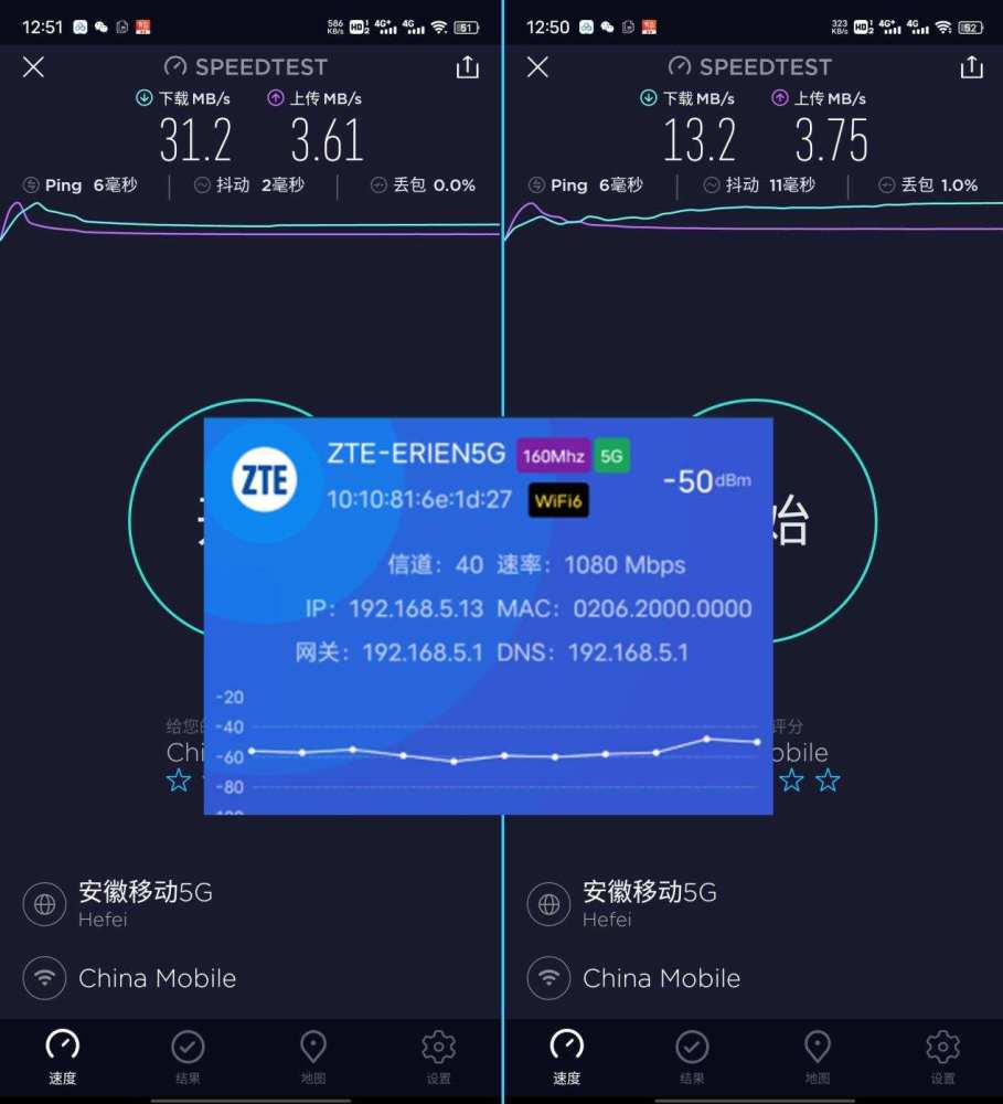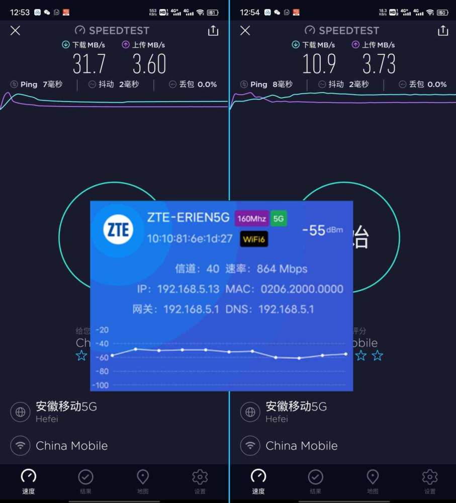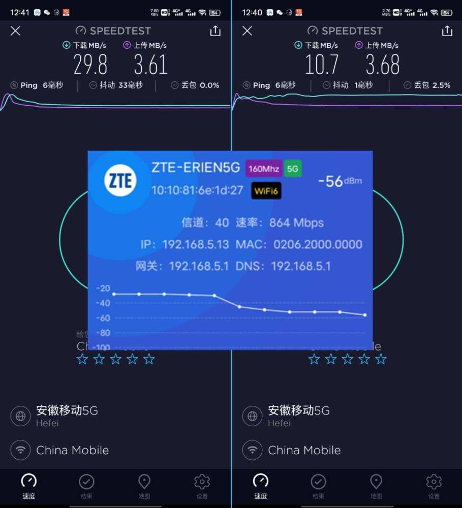 1号阵地1由大约三米外的墙隔开,关闭测试,2号实际上测量了4G波段下载到10.7MB/秒,上传3.68MB/秒;下载在5G频率298MB/秒以下,上传3.61MB/秒以下;