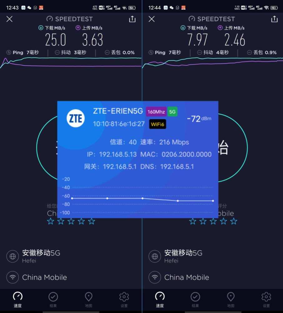 与路由器隔墙的试验点2,距离约12米,封闭试验,完整信号,实际2个测试4G波段下载到7.97MB/s,上传2.46MB/s;下载5G频率下至25MB/s,上传3.63MB/s;