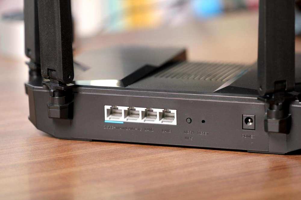 5GE门户和3个局域网门户,其中1个是1 GLAN,可以在路由器设置中以2.5G或1G模式自由配置。还有WPS键、REET键和AX5400Pro后面的电源界面。