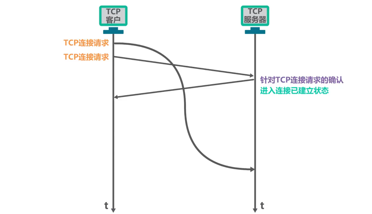 一段时间后,未成功的TCP网络连接请求到达了TCP服务器程序,该程序错误地将其误认为另一个TCP客户程序,启动了一个新的TCP连接请求,并将TCP客户送至TCP程序,以确认连接请求并加入已建立的连接。