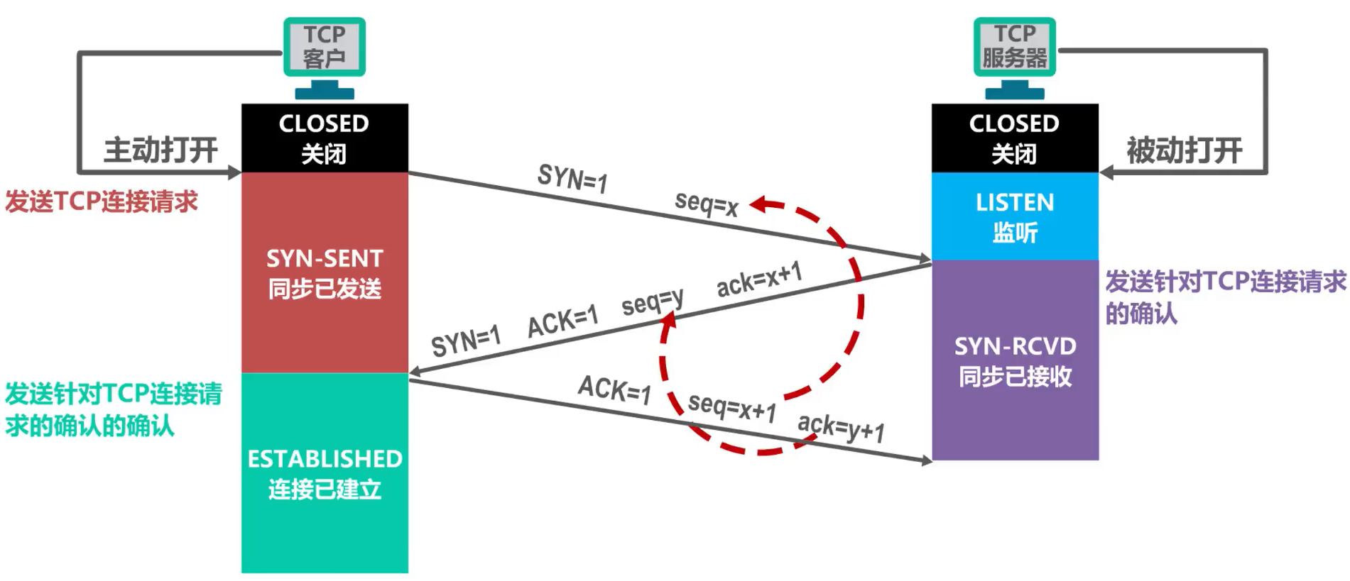 TCP 连接形成程序包括三小时握握。 在握手之前,活跃的开放客户端完成了 CLOSE 阶段, 被动的开放服务器终止了 CLOSE 阶段, 并开始了 ListEN 阶段 。