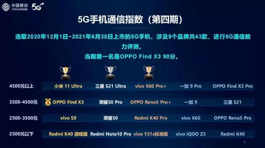 2020年12月至2021年6月,中国利用OPPO发现X3号,在5G移动电话移动5G移动移动通信指数中位居首位,前5G通信实验室对此进行了严格审查。