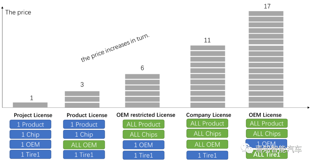 AutoSAR制造商允许的步骤的定价如下:最廉价的许可只能提供给由公认的一级供应商制造的单一的ECU产品,其具体的芯片只能供应给OEM。 批量货物(图中的单个步骤块)的价格超过500万元,如果需要功能安全,则乘以1。