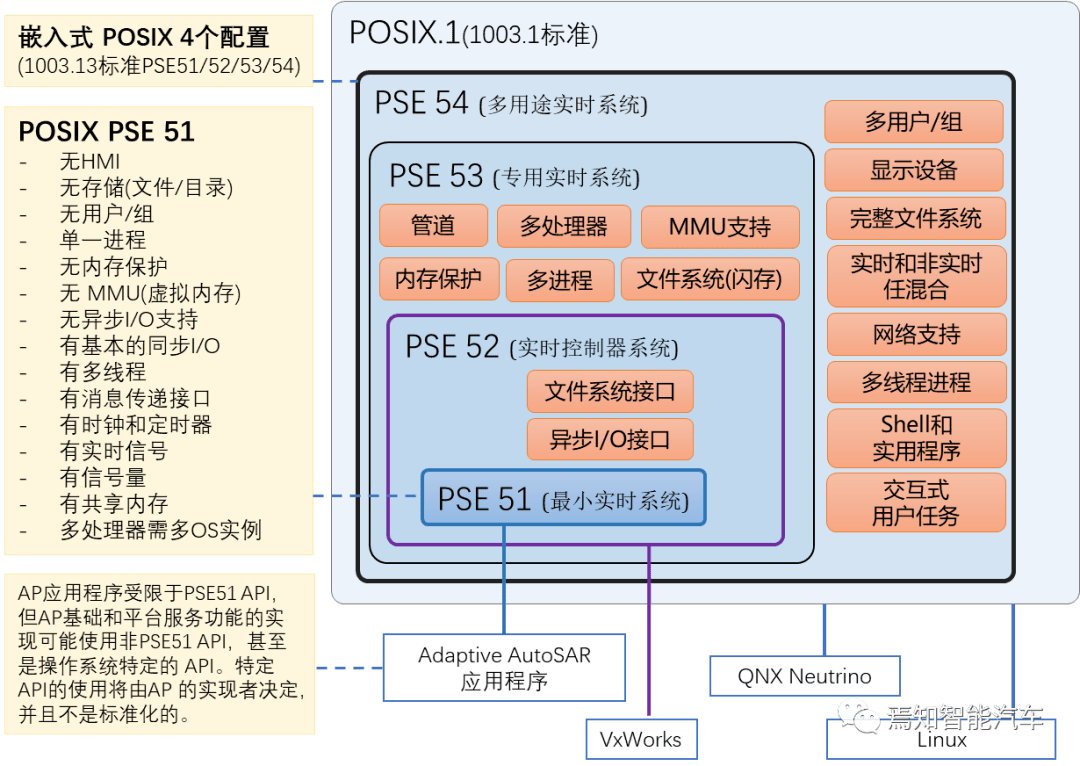 PSE52是一个分水岭点,在这个点上,基于PSE52的中间SOA平台可用于大多数RTOS系统,如VxWorks、RT-Tread等。其他几个RTOS也拥有自己的POSIX兼容层,可作为SOA中间体的操作平台。SOA应用在这些平台上使用的OSS平台的API应仅限于PSE51。