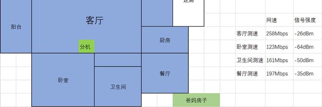 真正的客厅速度(移动电话与分机连接)以最大净速可能达到256兆字节,附近卧室、浴室和餐馆的100多兆字节以上,卧室仍是一个老问题,墙壁和壁橱被堵住。