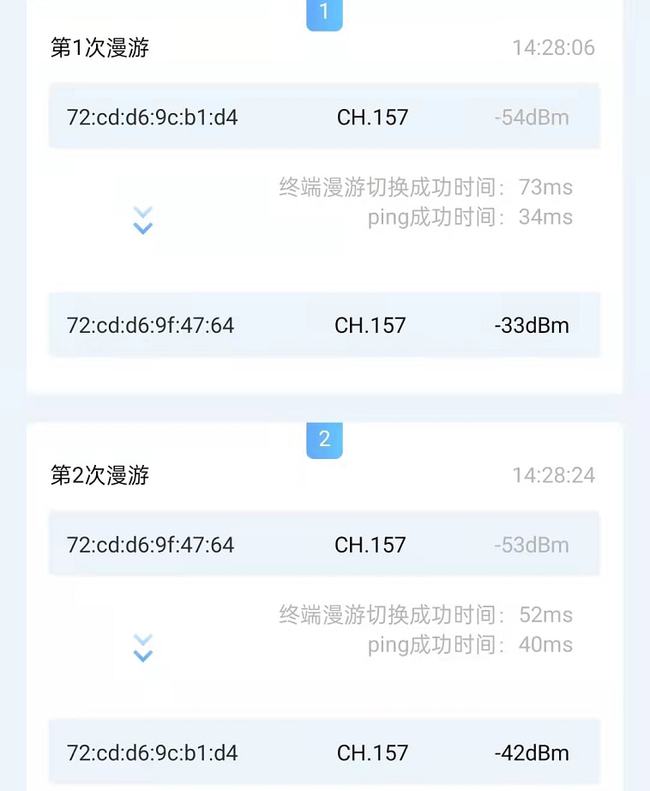 在MESH网络之后,漫游测试显示,当信号强度为54dBm(实际上,该信号与需求完全吻合,如先前的网络速度测试所确定)时,就会开关。