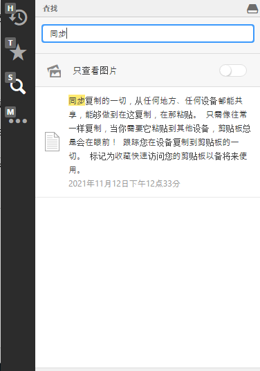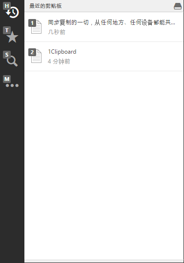 下载安装后, 图标在任务栏中被发现, 访问界面是打开的。 它被分割成最近的剪贴板、 标记的剪贴板和三个特性。 我们自动切入程序, 无论是在网页上复制它, 还是在文档中复制它。 如果您复制更多, 您可以进入搜索功能页面, 输入用于快速搜索的内容的关键词 。