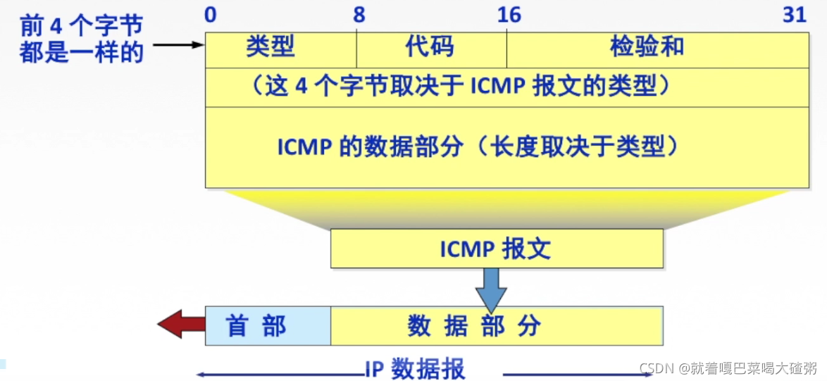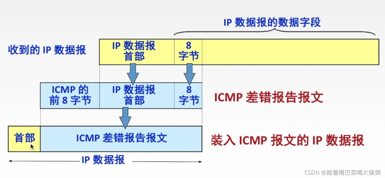 当组传输错误时, 网络层会直接丢弃该组, 并发送特定的 ICMP 错误信息。 因此, IP 数据报告是 ICMP 报告的一部分 。
