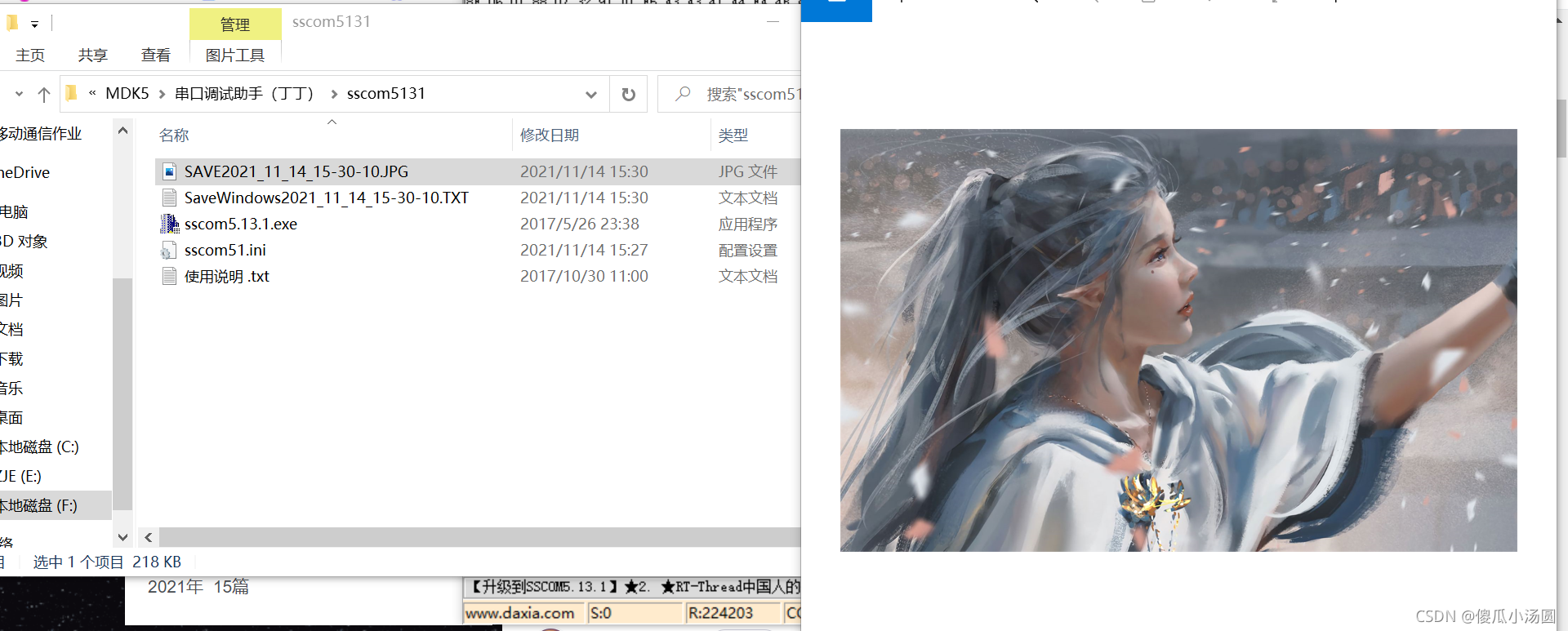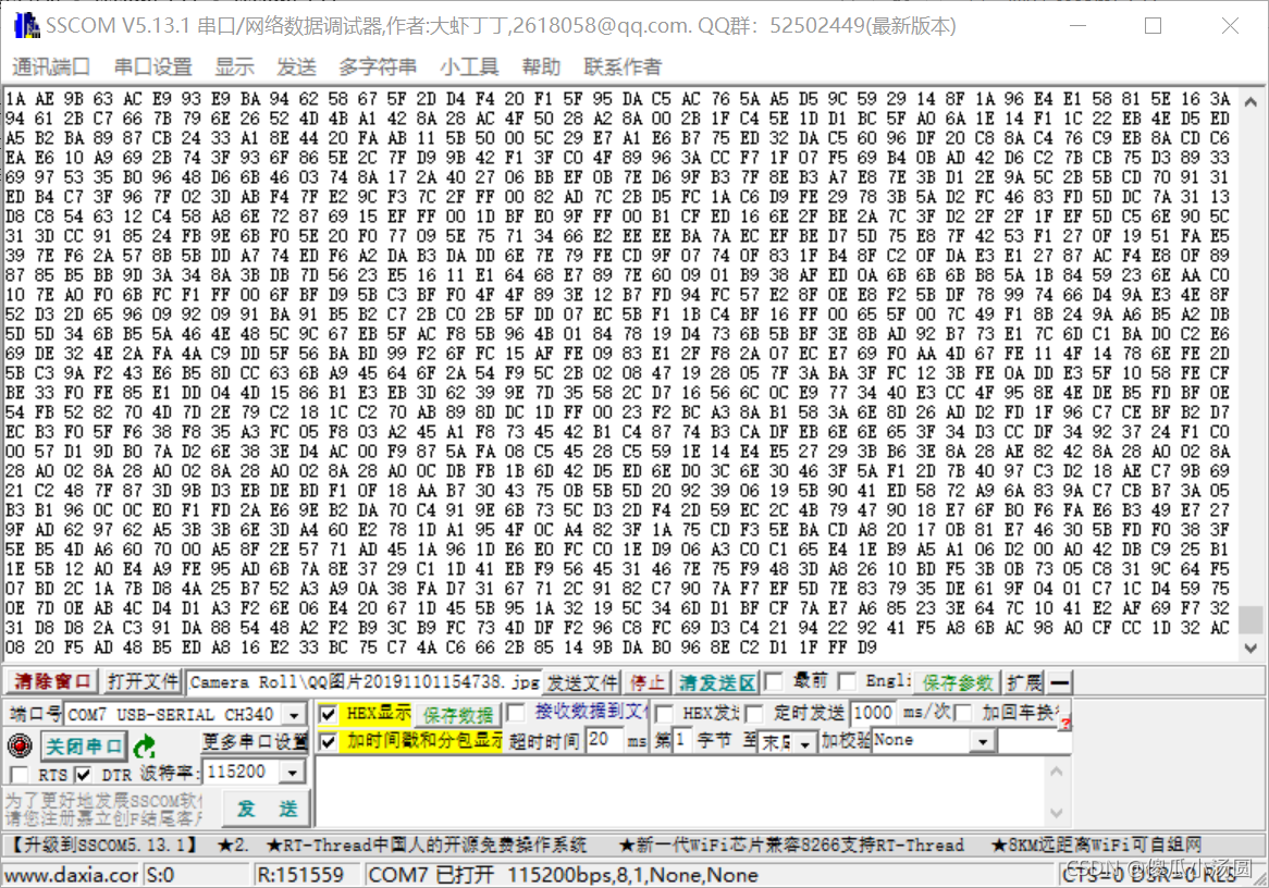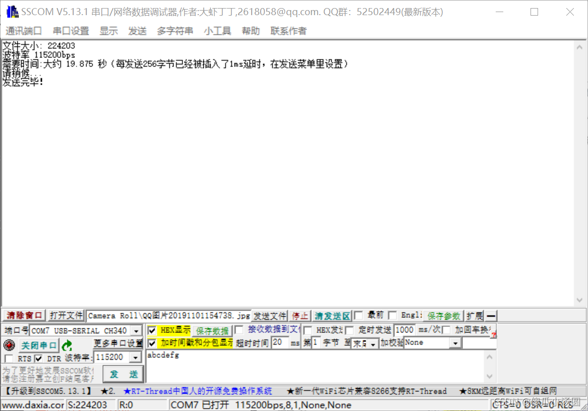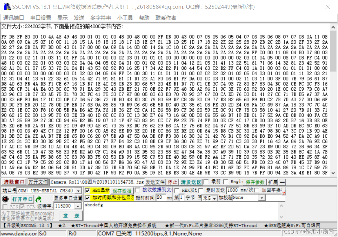 打开连环助理,选择以下参数:Porter 115,200,200,打开 HEX 显示,然后打开文件,单击要传输的文件,只要文件已经准备好发送,接收器设置也是如此。我在这里选择了 224003 的字节大小来发送照片。