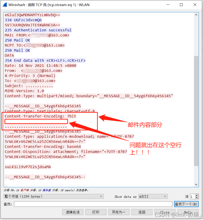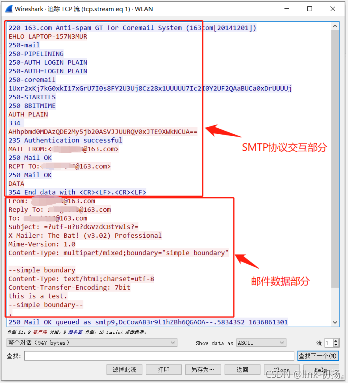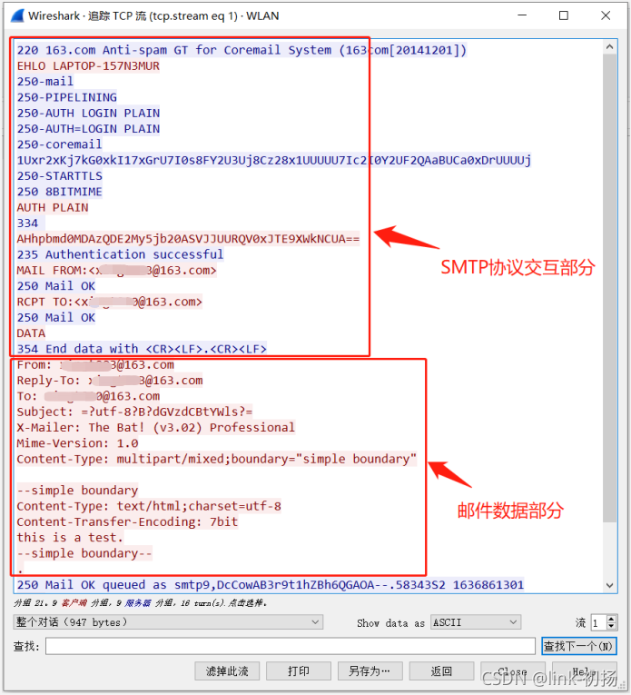 使用上述Haikang之间的接口发送测试邮件并不成问题,而收到的邮件也具有指导意义。所以把Haikang的邮件包(tcp.Port=25)从Haikang过滤出信息:
