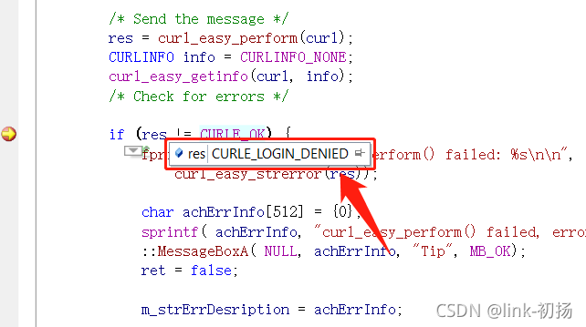 在代码中添加已发现的断点调试curl_easy_perform接口返回的错误码为CURLE_LOGIN_DENIED,如下所示: