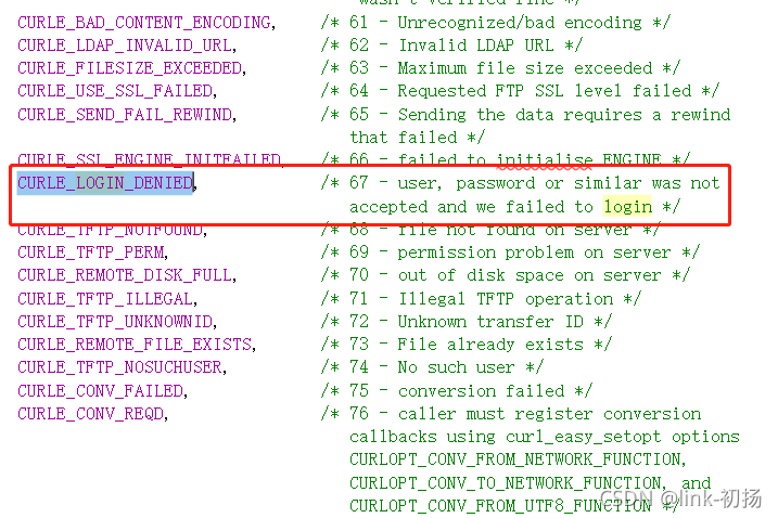 然后我们走过CURLE_OK, 转到错误代码定义页眉文件, 并查看 CURLE_LOGIN_DENED错误代码的含义 :