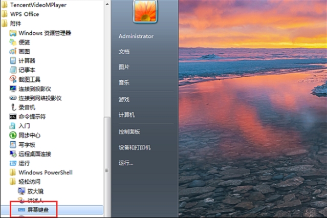 点击计算机的“ 启动” 按钮并访问“ 全部程序 ” 。 查找附件并选择“ 远程访问 ” 。 “ 在一天结束时, 选择屏幕键盘 。 ”