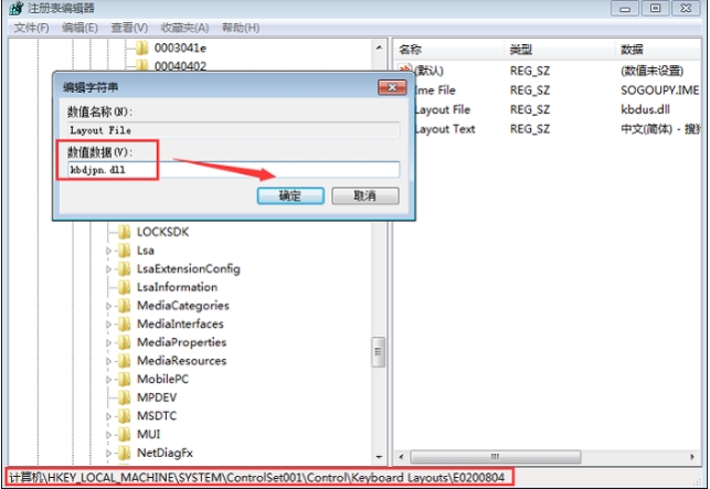 在注册编辑页面上双击“Layout file”, 然后“HKEY_LAWOL_MACHESYSTEM controlSet001 controlKeyboardLayoutE080804” 以调整“kbdus.kbdjpn.dll” 中“kbdjpn.dll” 中的“kbdjpn.dll” 键并按“OK” 按钮。