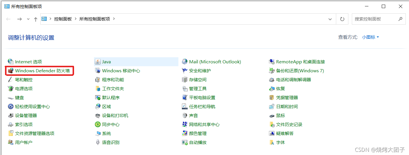 第1步:打开控制面板,然后在桌面或任务栏搜索框中搜索 Windows Defence 防火墙: