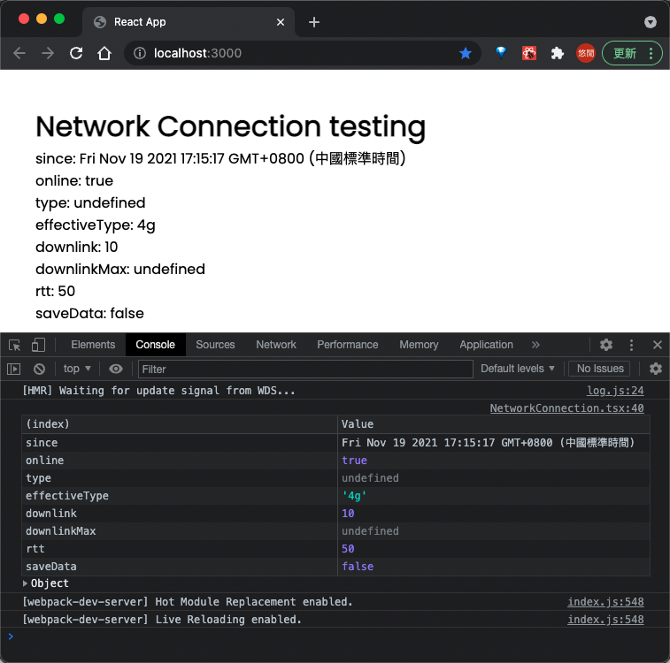 /src/components/NetworkConnection.tsx现在,让我们来描述一下我们将要记录的网络状况 除了我们讨论过的内容之外 我们还将保持最后的更新