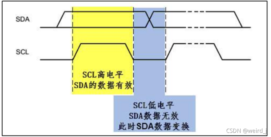 当 I2C 通信时, SDA 数据传输只有在 SCL 处于高电解度时才有效。 SDA 信号线用于传输数据,而 SCL 信号线用于确保数据同步。
