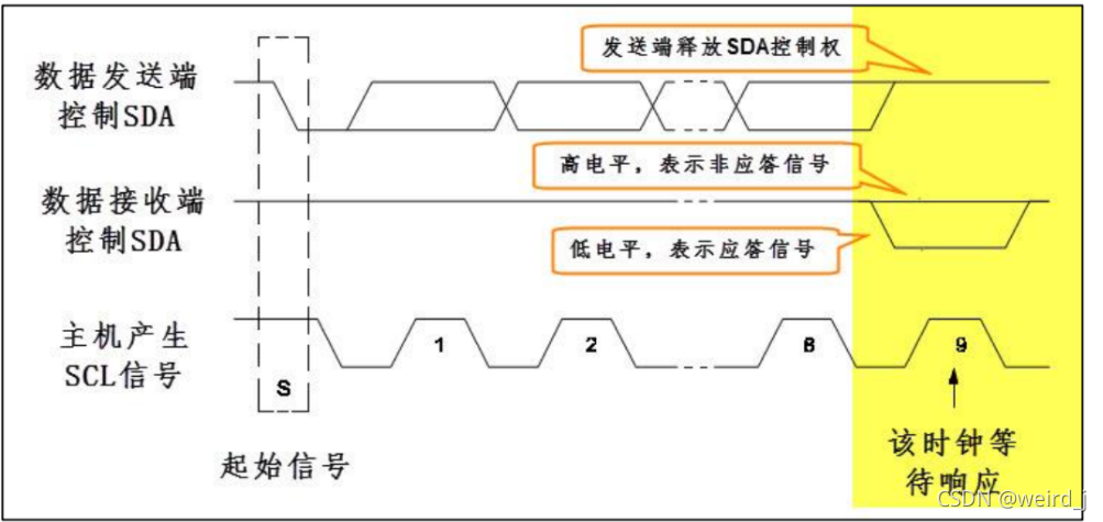 当SDA发送数据时, 接收者会回复收到的数据。 如果您想要继续发送数据, 请对响应信号( 低级别) 作出反应, 或者对非响应信号( 高级别) 作出反应 。