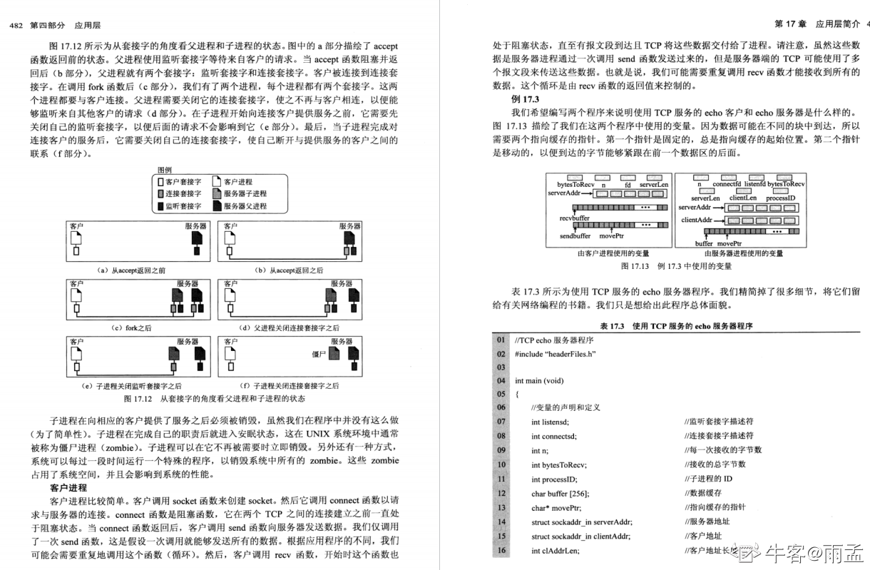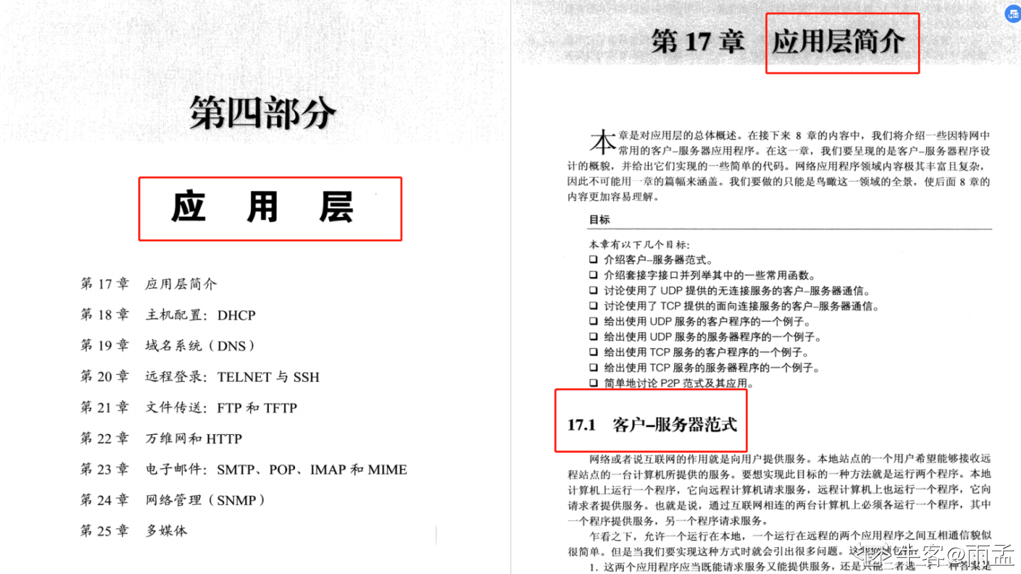 第四节(申请层)包括第17至25章,介绍了申请层的广泛概念,包括客户/服务器示范方案拟订(第17章),随后全面处理了七项申请级协议(第18至24章),第25章专门论述互联网上的多媒体技术。