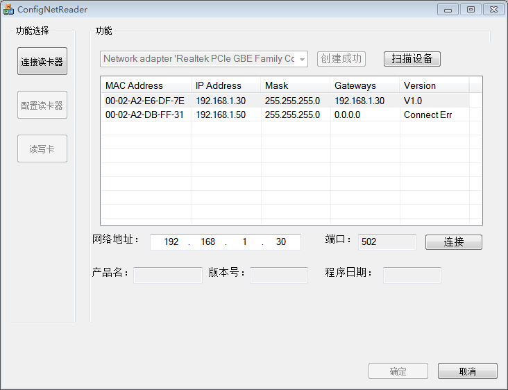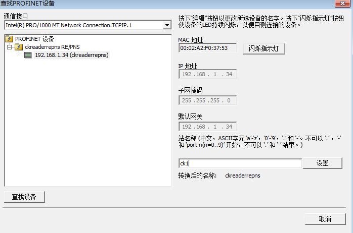 选择“工具”->“查找PROFINET设备”->选择扫描出来的读卡器“ckreaderrepns”->点击“设置”->填写“ck1”跟前面步骤3一样的名字,再次点“设置”
