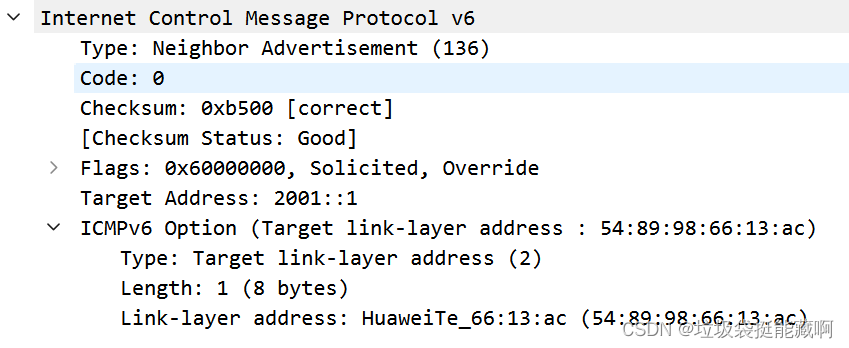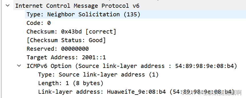 我们从中可以看到NS提交文件的结构;很明显,它只是在ICCMP的数据部分中完成,并转换为ICCMPv6选项,这一选项的领域被分为三段,第一段是类型类型类型类型,确定源的第二层地址,然后是长度(8字节),最后是源的MAC。