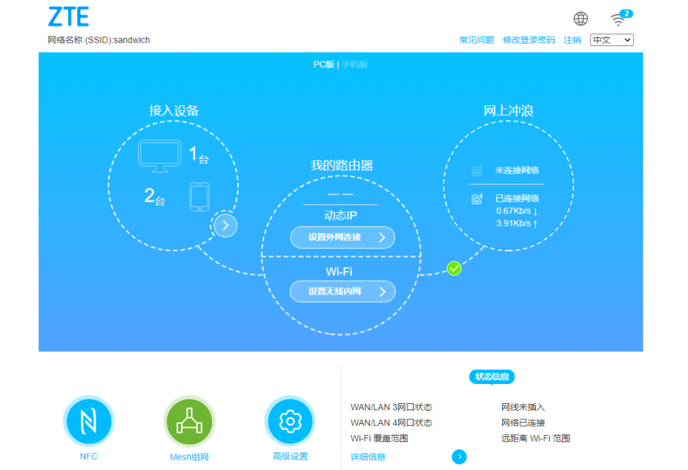 当设置完成后,我们将处于WEB管理主页的中心,我们可以看到各种参数,例如路由器的基本状态、访问装置,以及简单的设置,例如更改无线网络名称、设置上网方法和设置路线。虽然没有复杂的参数设置,但对于普通家庭客户来说,这种简单明了的配置可能更理想。