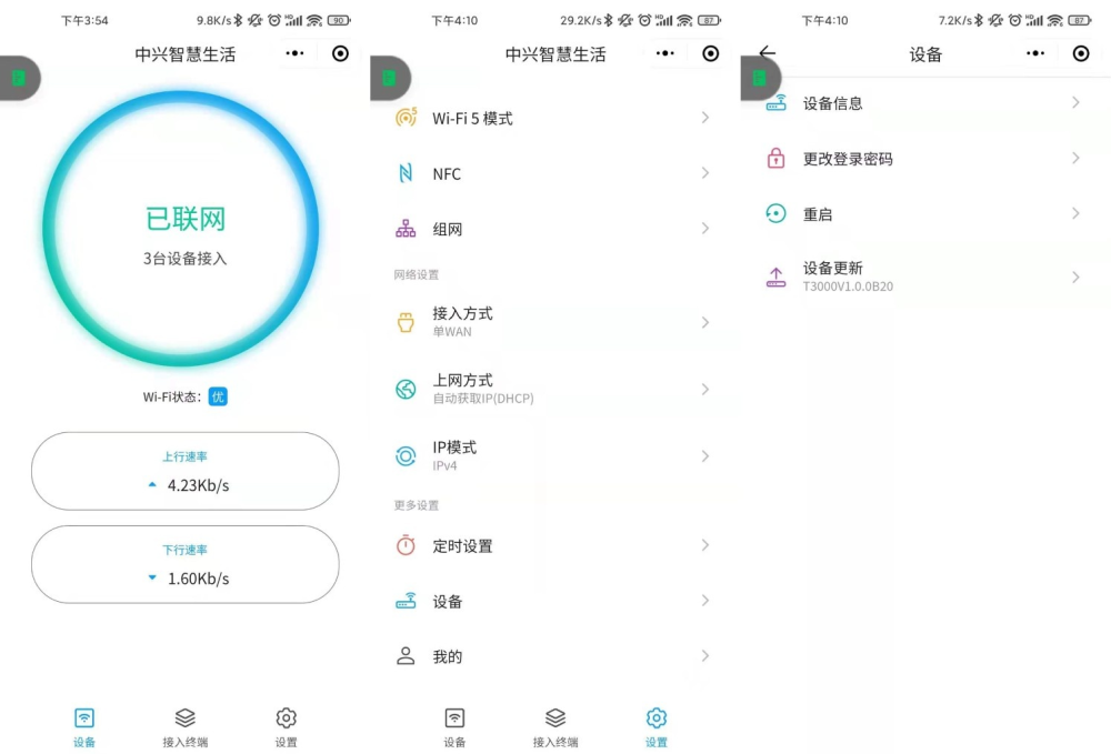 移动电话末端的用户也可以使用“ 中智力生命” 小程序控制路由器状态。 小程序比WEB管理页面的设置功能更少,但界面设计也比较简单,使用户能够配置无线、无线、无线、5号模式,供客人使用自己的无线网络。