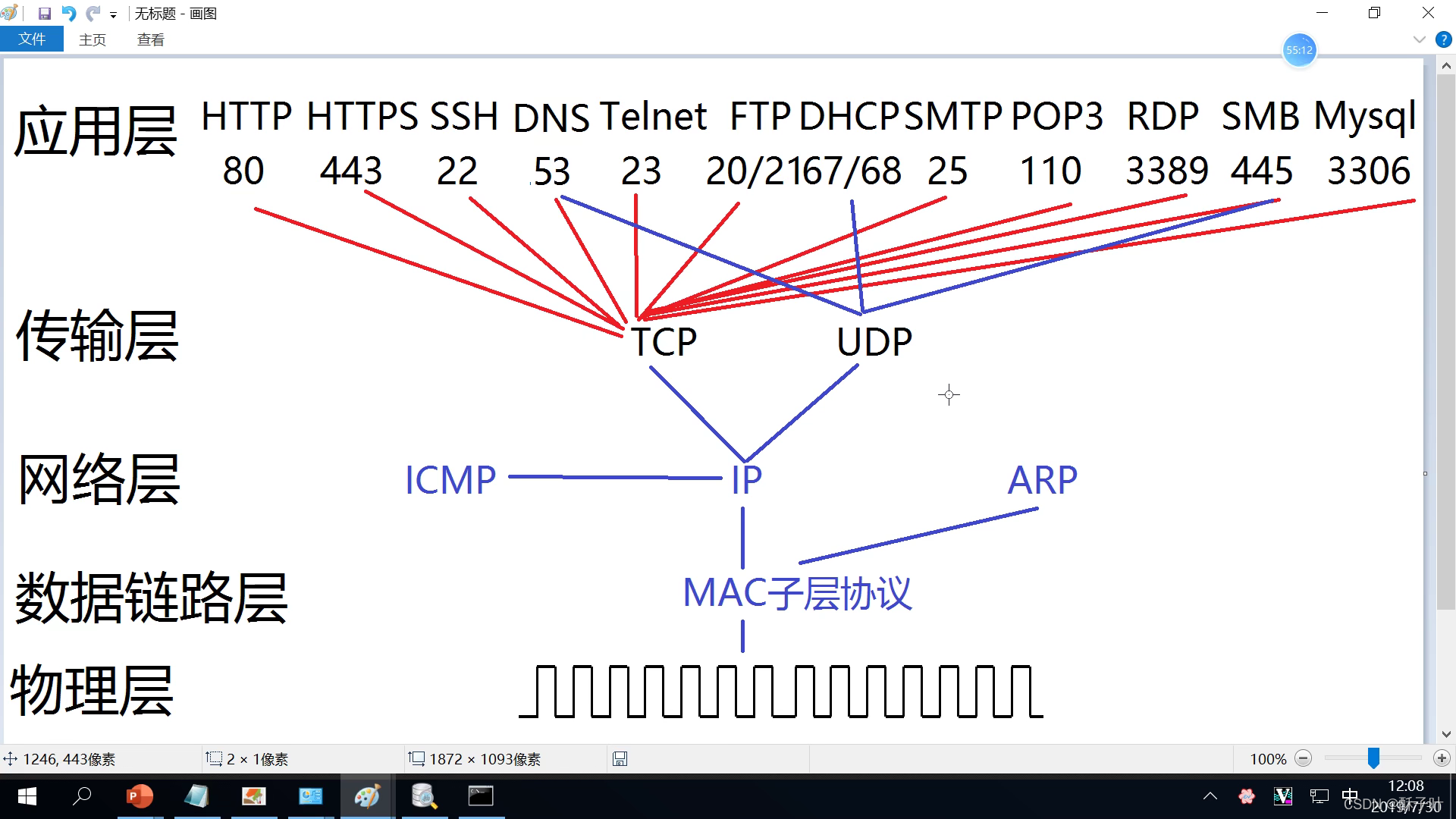 TCP/UDP信头(源港口、目标港口)数据部分(分散)转移层:流程通信