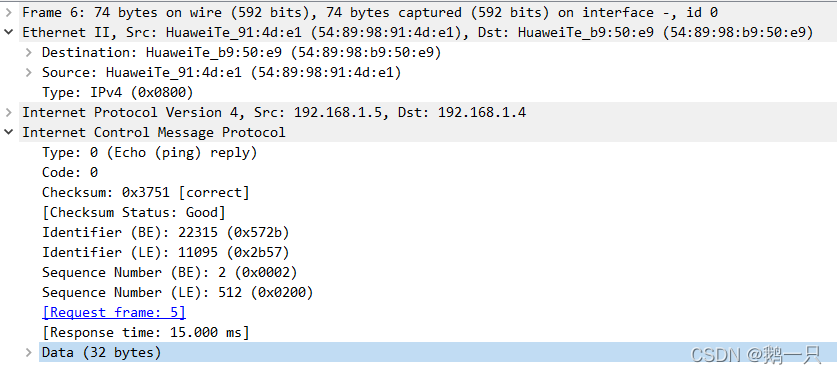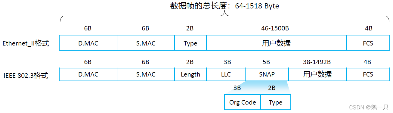“6字节源MAC”+“6字节目标MAC”+“2字节类型(网络协议0x0800 ipv4 0x86d ipv6 0x0806 arrp, 0x0x代表十六进制)”+“46-1500字节数据”+“4字节FCS核查”