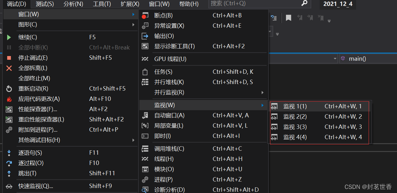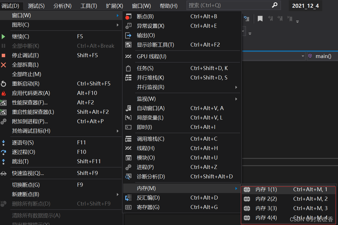 内存信息可以在调试窗口内存中查看,有四个窗口可以让我们访问内存信息。