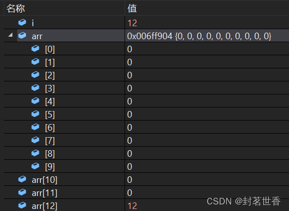 当我们访问一个[12]时,数组横跨了三个地址,而一个[12]地址与i相同,因此两个数值都发生了变化。