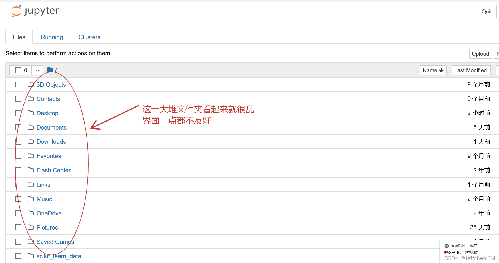 问题描述Jupyter 的安装与以下内容相似, 界面是一大堆纸, 令人困惑。 首先, 我试图删除这些文件夹, 并删除它们, 因为它们在被删除之前必须是空的, 这实际上是一种保护机制, 如果它们被删除, 你保存在电脑上的一些关键的东西可能会消失。