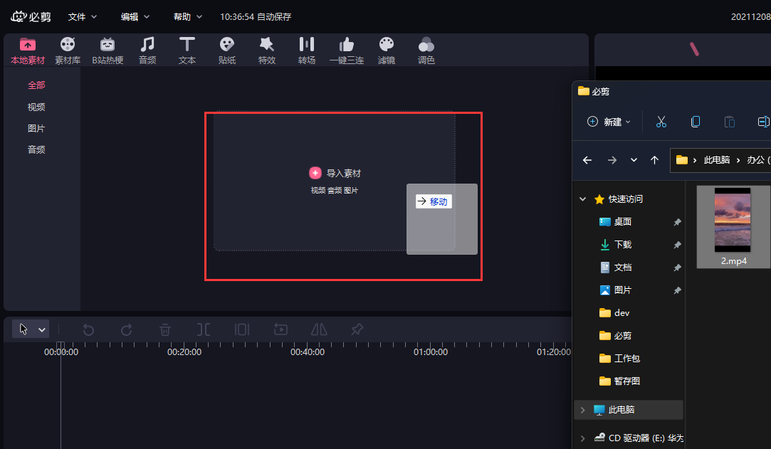 在访问接口后,我们要求必须修改的内容输入适当的剪辑,我们可以将材料直接拖入进口材料部分并点击待插入的材料。